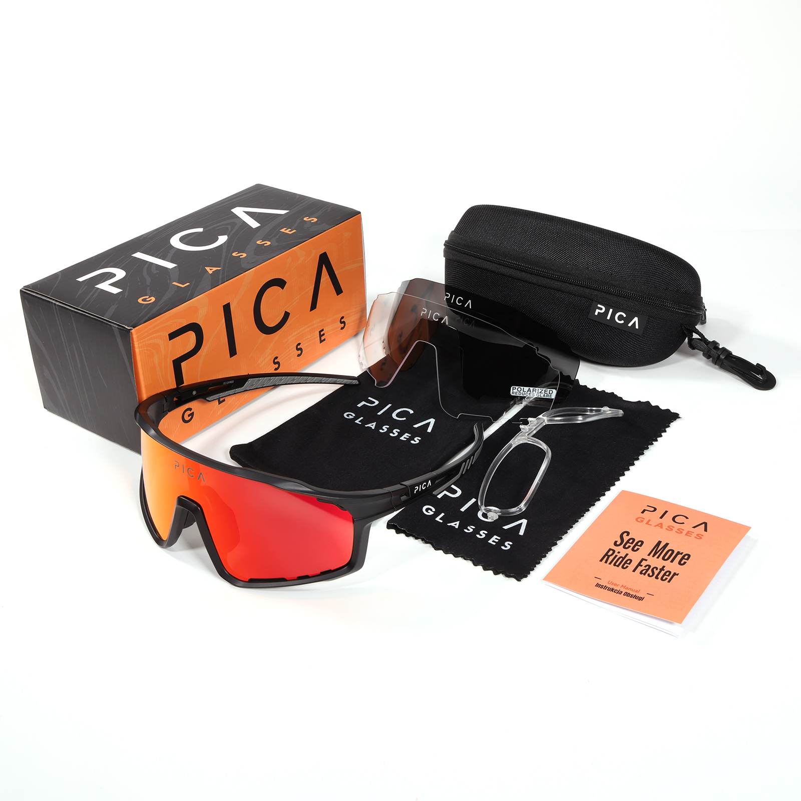 Si vous portez des lunettes de prescription, Pica Strix a la solution parfaite pour vous. L'ensemble comprend un adaptateur d'objectif d'ordonnance, qui vous permet de profiter de l'utilisation de lunettes de sport, sans avoir à abandonner la correction. La sécurité de vos lunettes est assurée grâce à la couverture dure incluse dans l'ensemble. Dans l'ensemble, vous trouverez également une couverture douce et un chiffon pour les verres de nettoyage.