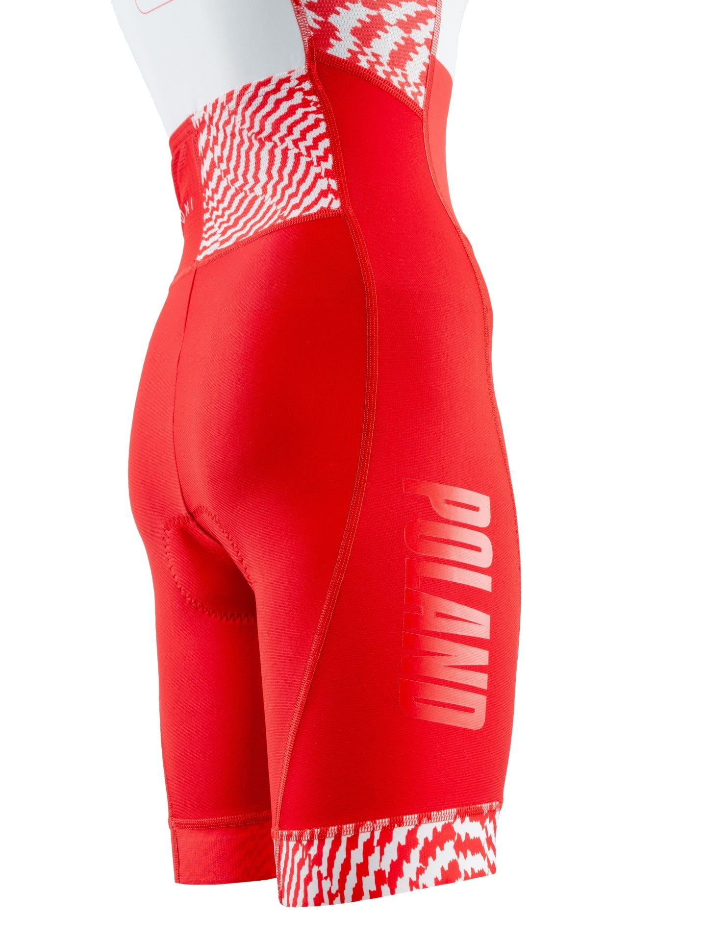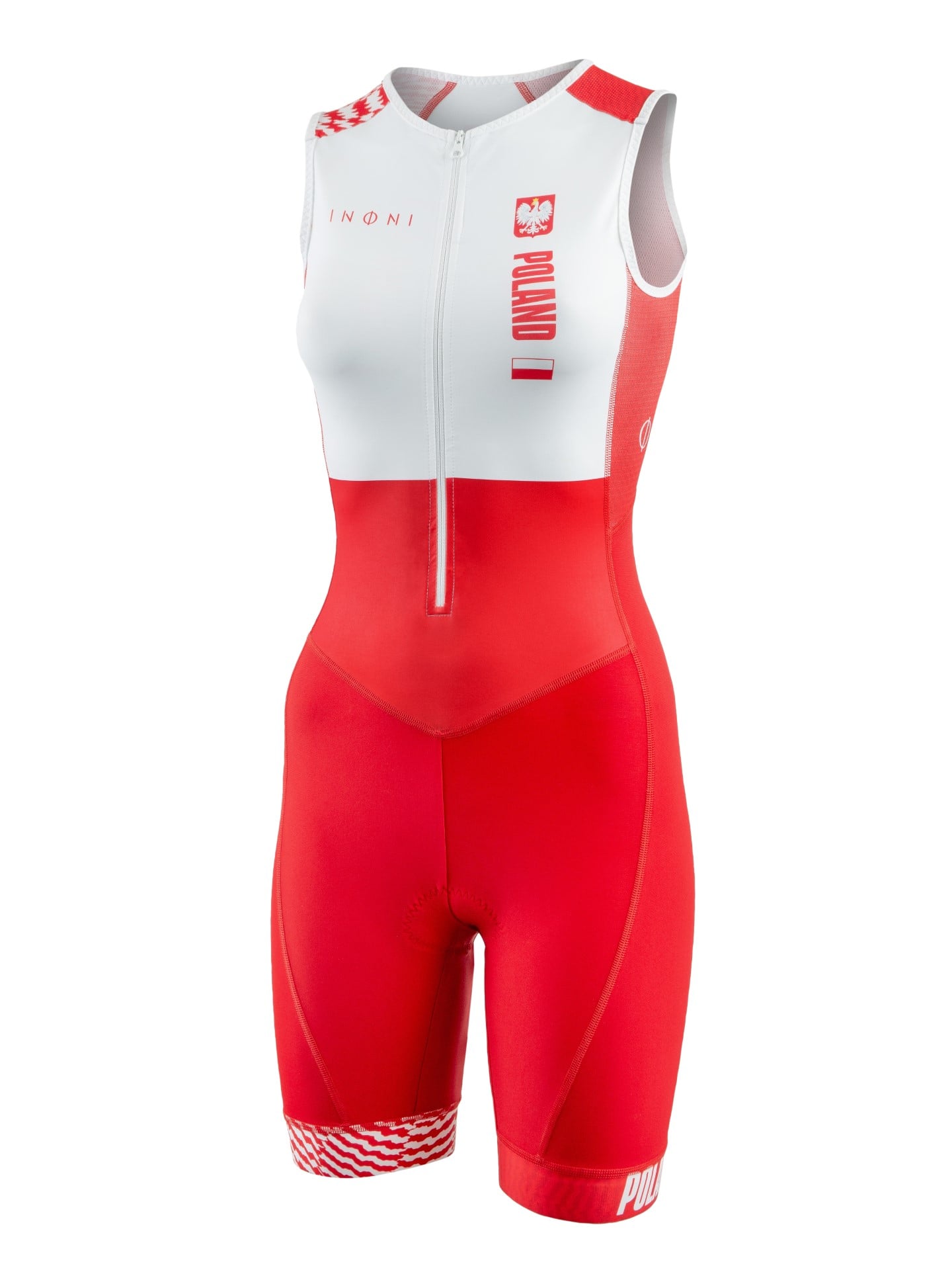Damski kombinezon triathlonowy bez rękawów w biało-czerwonej odsłonie.